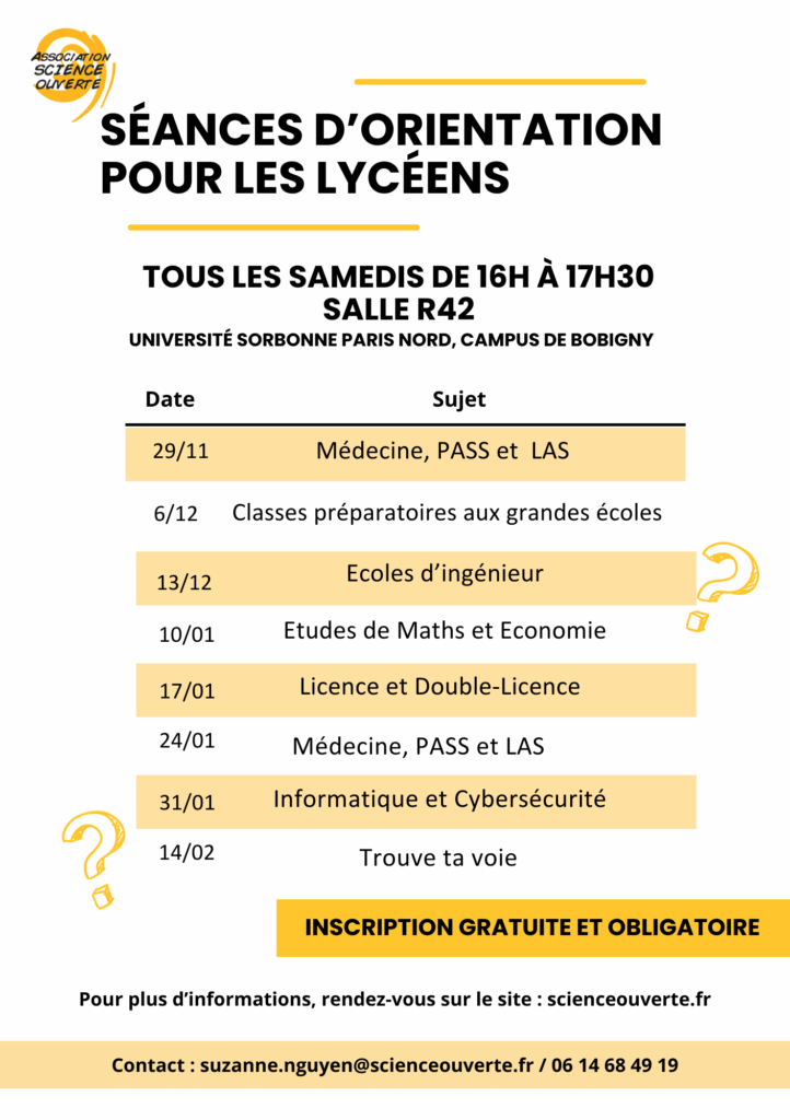De novembre à février, vient assister gratuitement aux séances d’orientation à destination des lycéens et de leurs parents à l’Université Sorbonne Paris Nord, campus de Bobigny, de 16h à 17h30.
